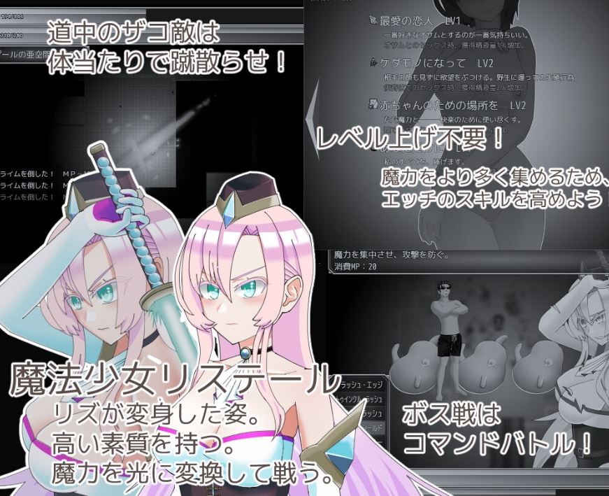 通过收集作为魔力源泉的“精液”,寻找敌人的据点,踢散杂兵深入最深处,并通过击败头目来推动故事发展。